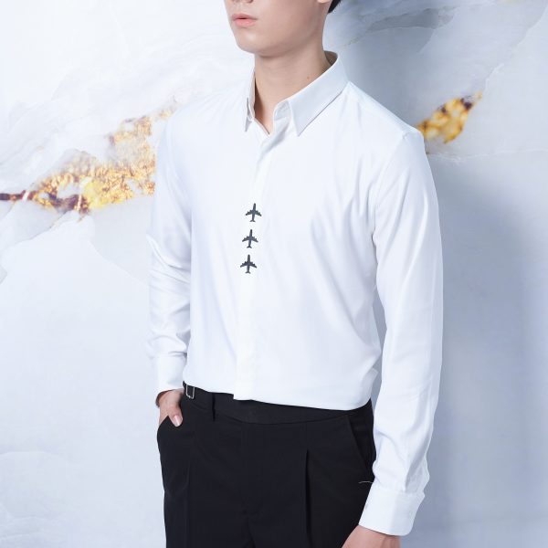 ÁO SƠ MI TRẮNG TRƠN NẸP LỘ KHUY IN LW DỌC THÂN TRƯỚC