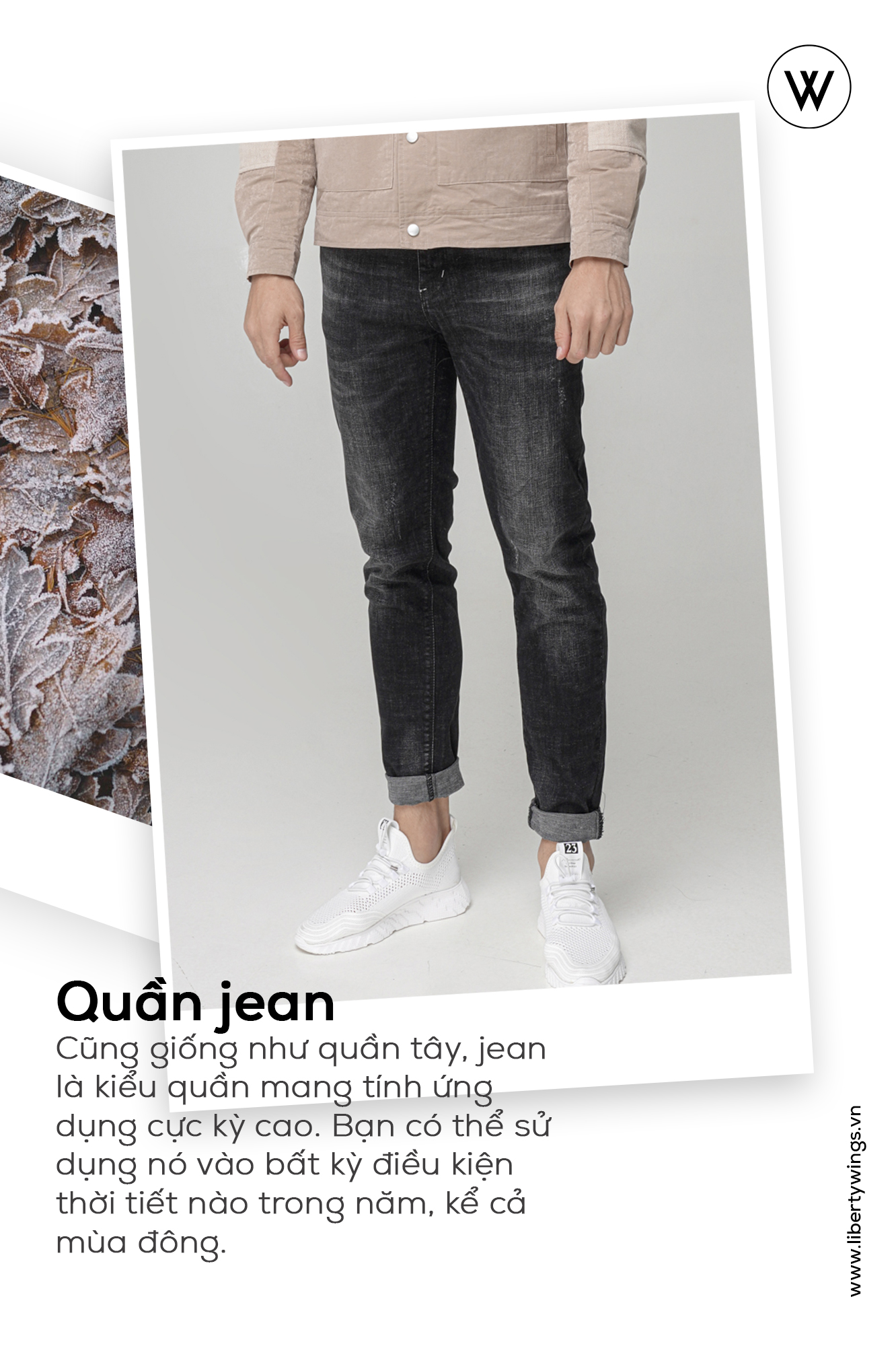 Cũng giống như quần tây, jean là kiểu quần mang tính ứng dụng cực kỳ cao. Bạn có thể sử dụng nó vào bất kỳ điều kiện thời tiết của mùa nào trong năm. Với quần jean năng động, khỏe khoắn và cá tính, rất thích hợp để phối cùng những chiếc áo thun nỉ phong cách, áo da hiện đại hay áo khoác mỏng, áo khoác phao, thêm một đôi sneaker để chuẩn style cực chất cho những ngày gió lạnh.